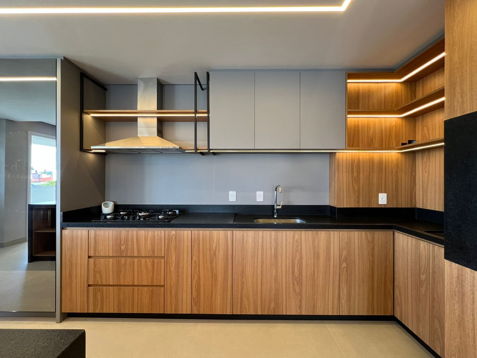Acabamentos e diferenciais: Piso porcelanato Portinari 0,90×0,90 na área social, piso laminado na área íntima, piso aquecido nos banheiros, paredes dos banheiros revestidas com Porcelanato Portinari e vista da sacada para a Avenida 10 de Setembro.