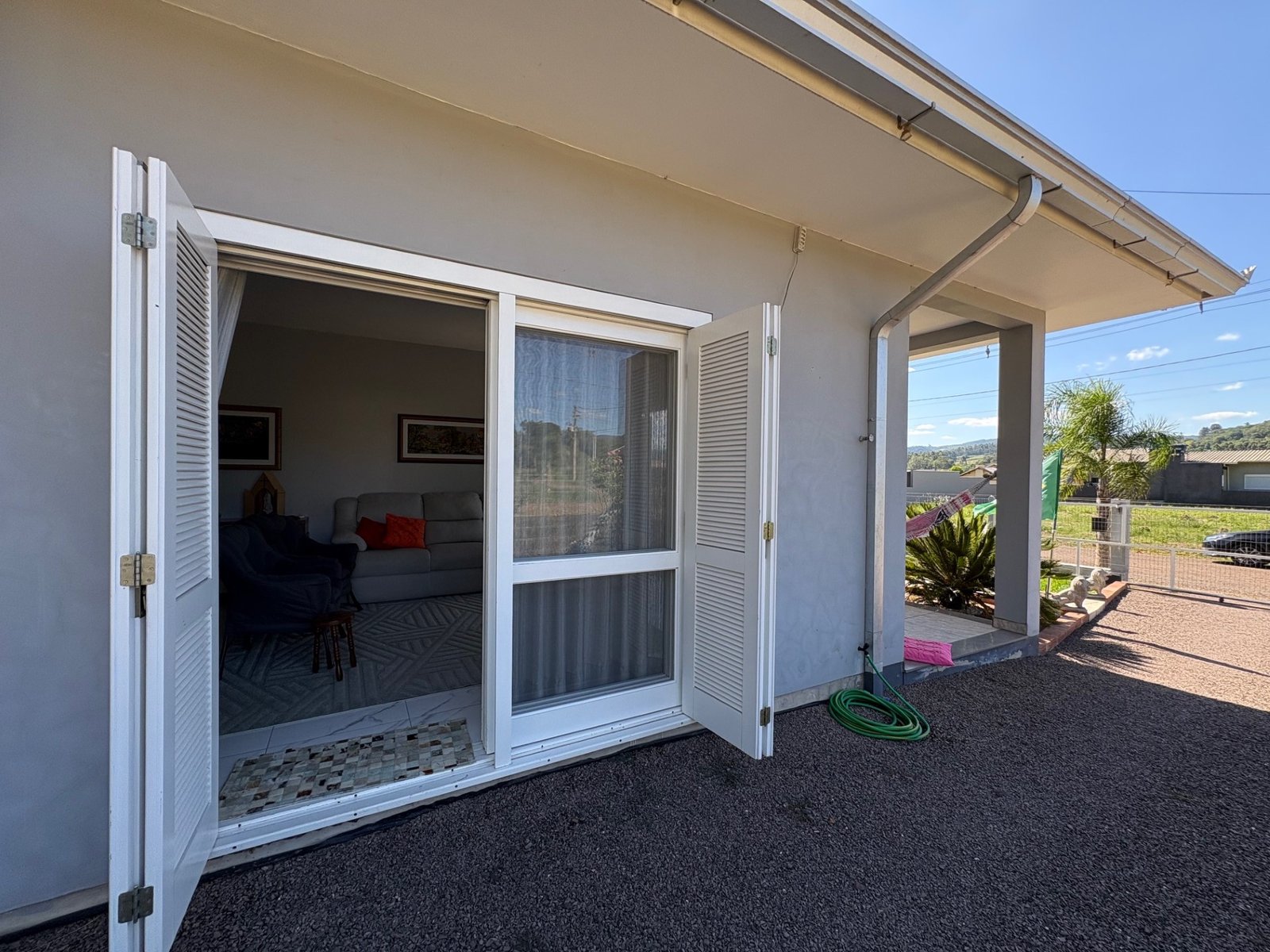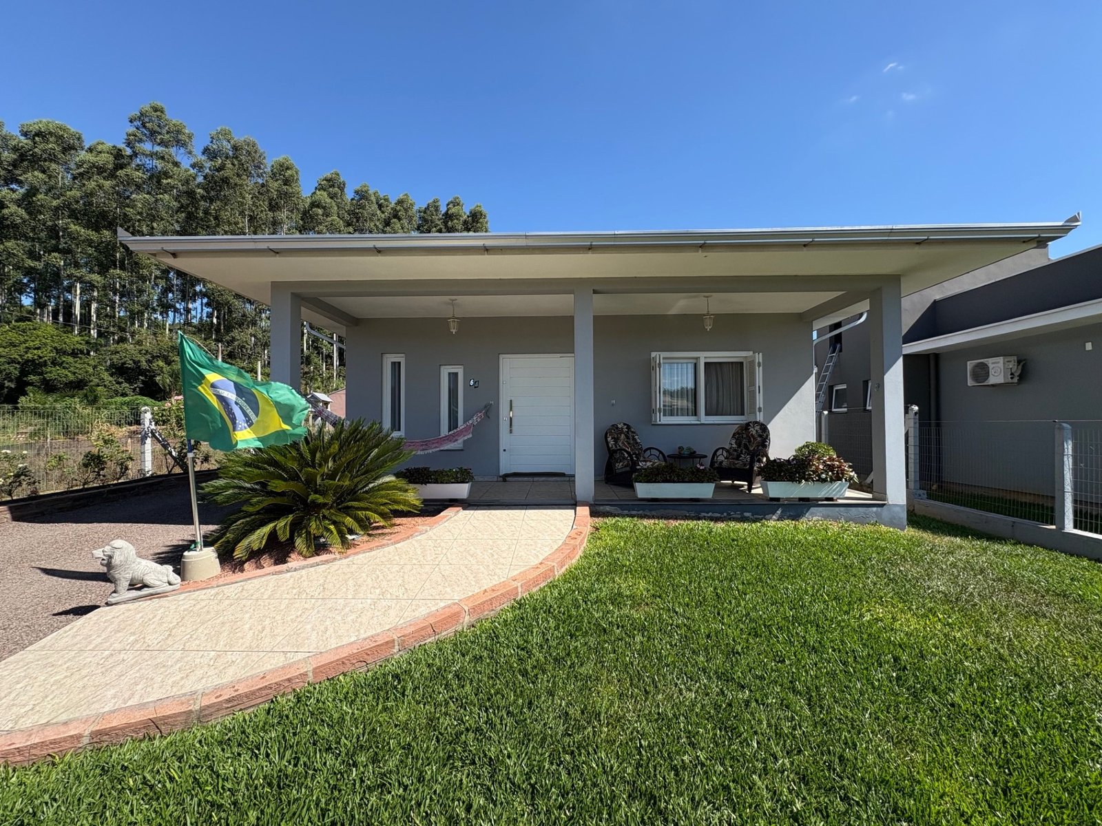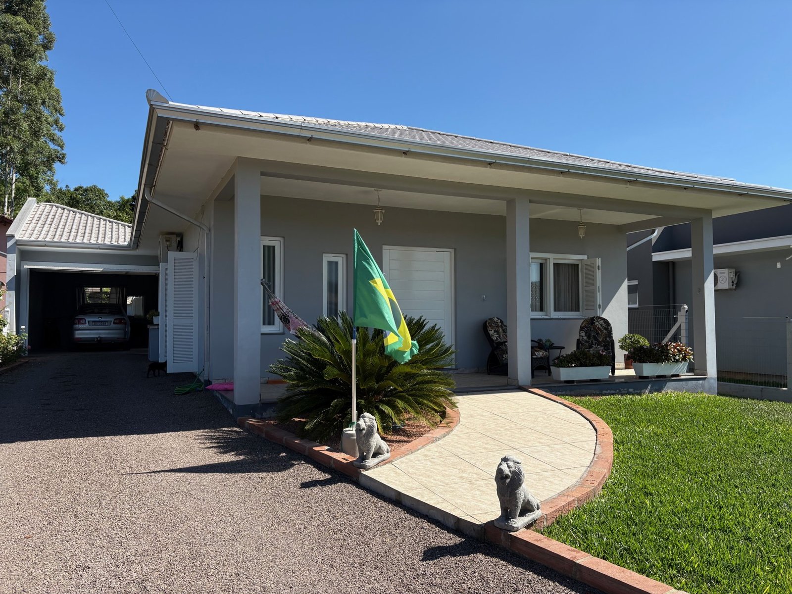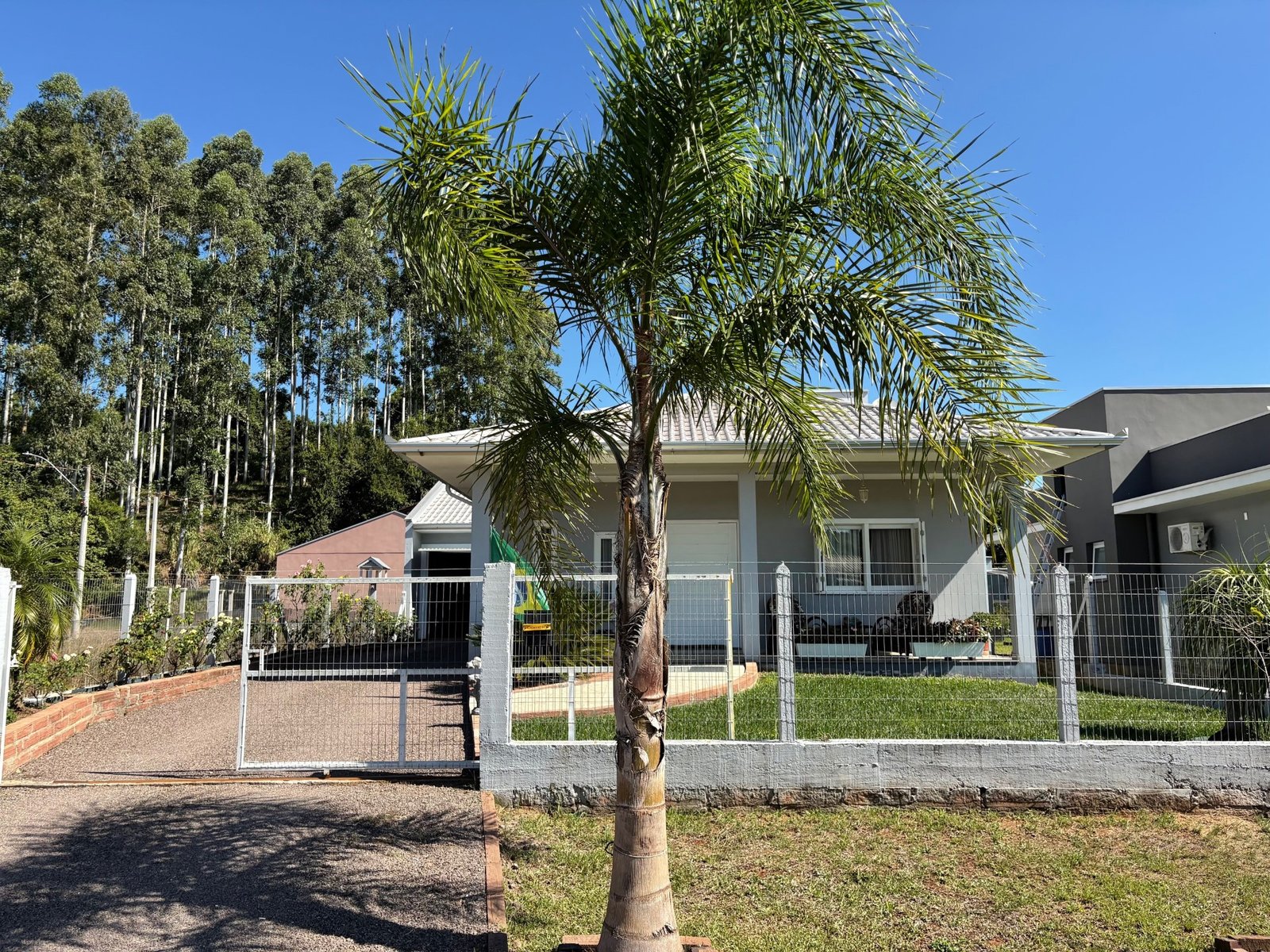 A casa principal, divida em dois dormitórios sendo uma suíte, três banheiros, sala de estar, jantar e cozinha em ambientes integrados, garagem e área de serviço, e 30 m² do quiosque, com um banheiro, área de serviço e churrasqueira.