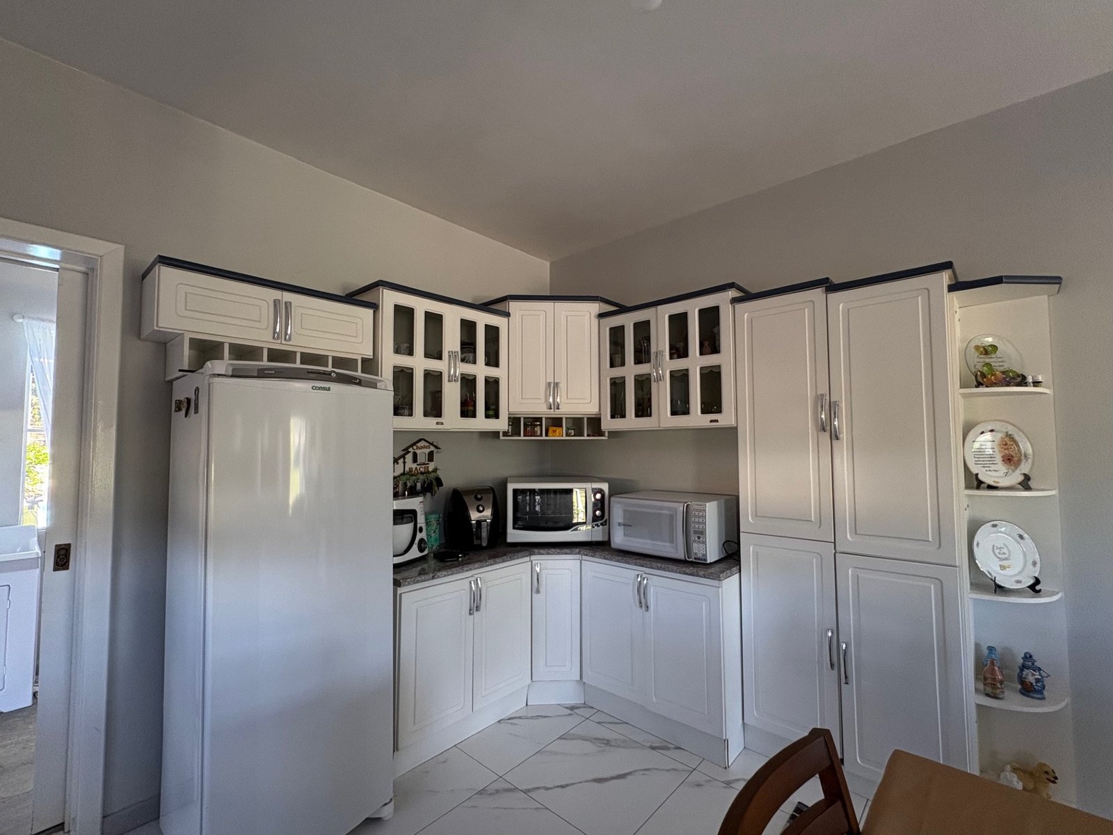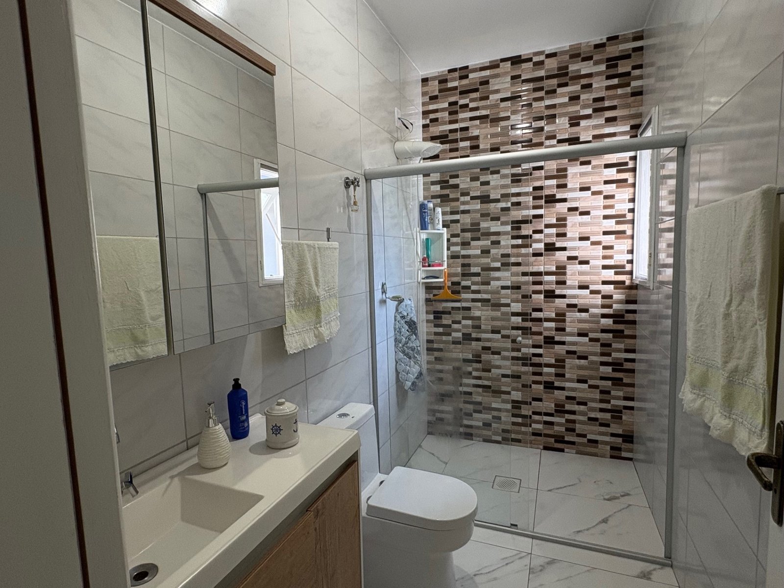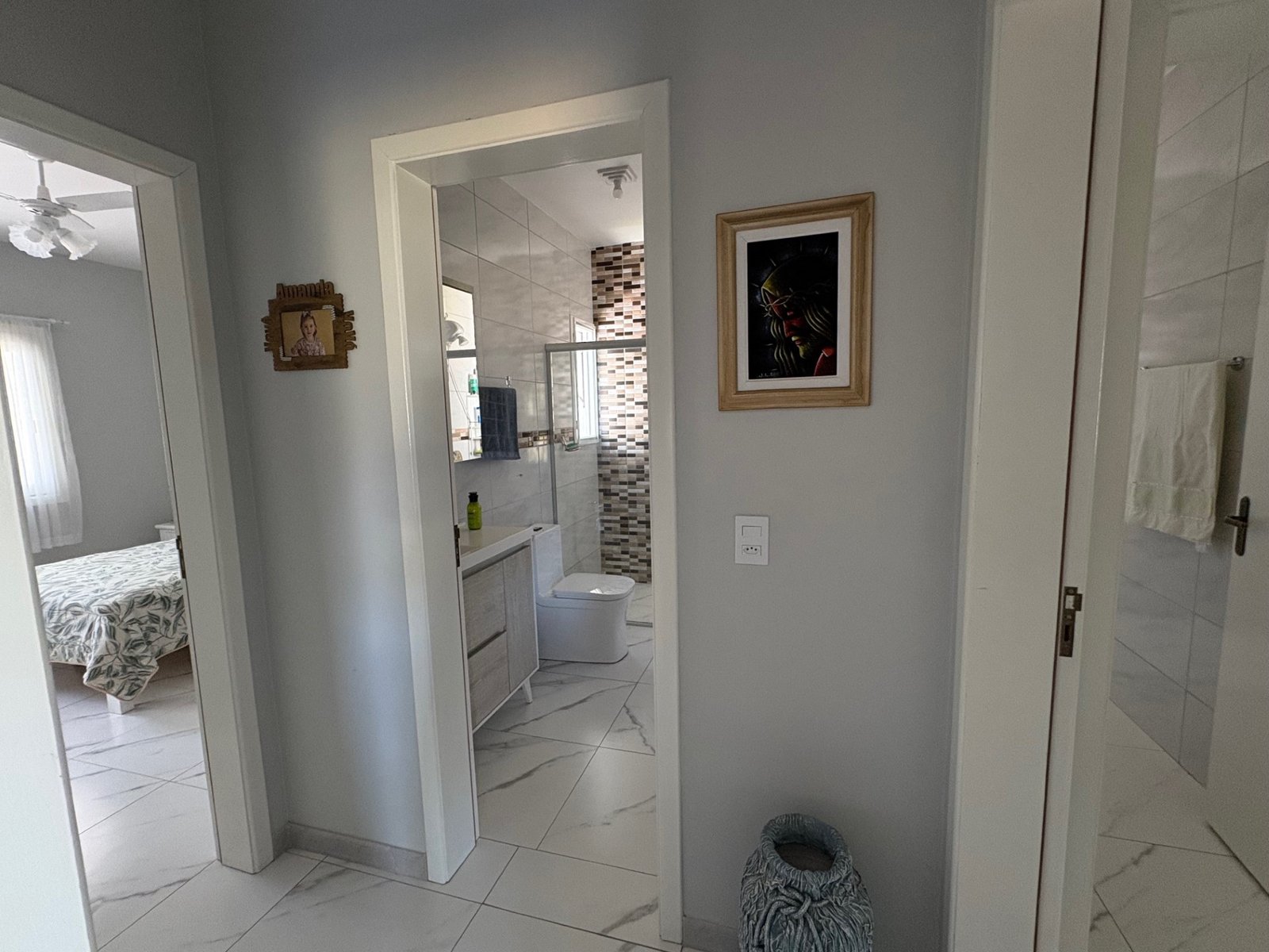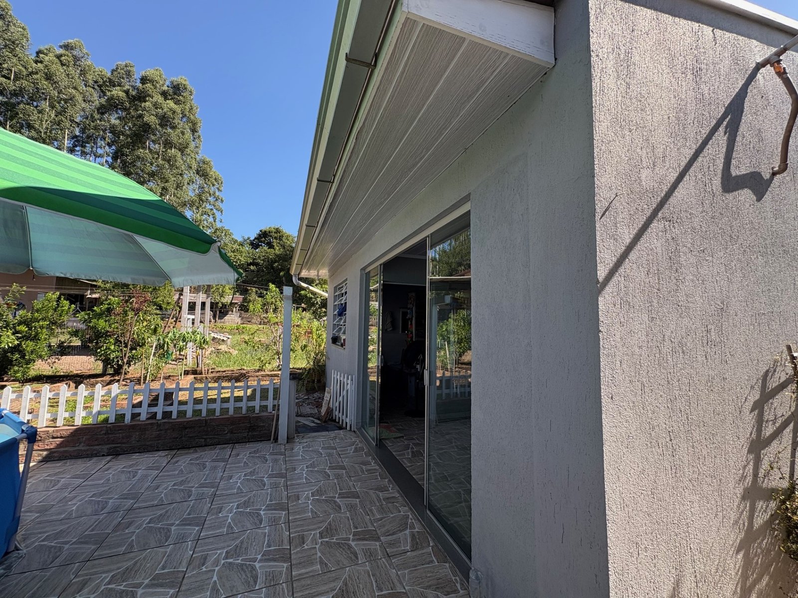 A casa principal, divida em dois dormitórios sendo uma suíte, três banheiros, sala de estar, jantar e cozinha em ambientes integrados, garagem e área de serviço, e 30 m² do quiosque, com um banheiro, área de serviço e churrasqueira.