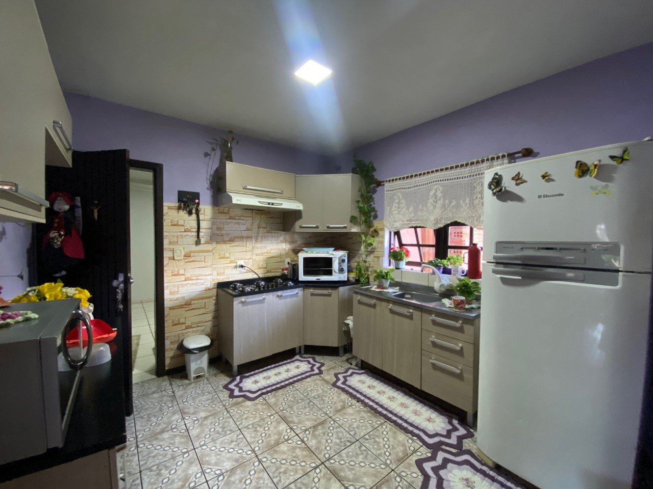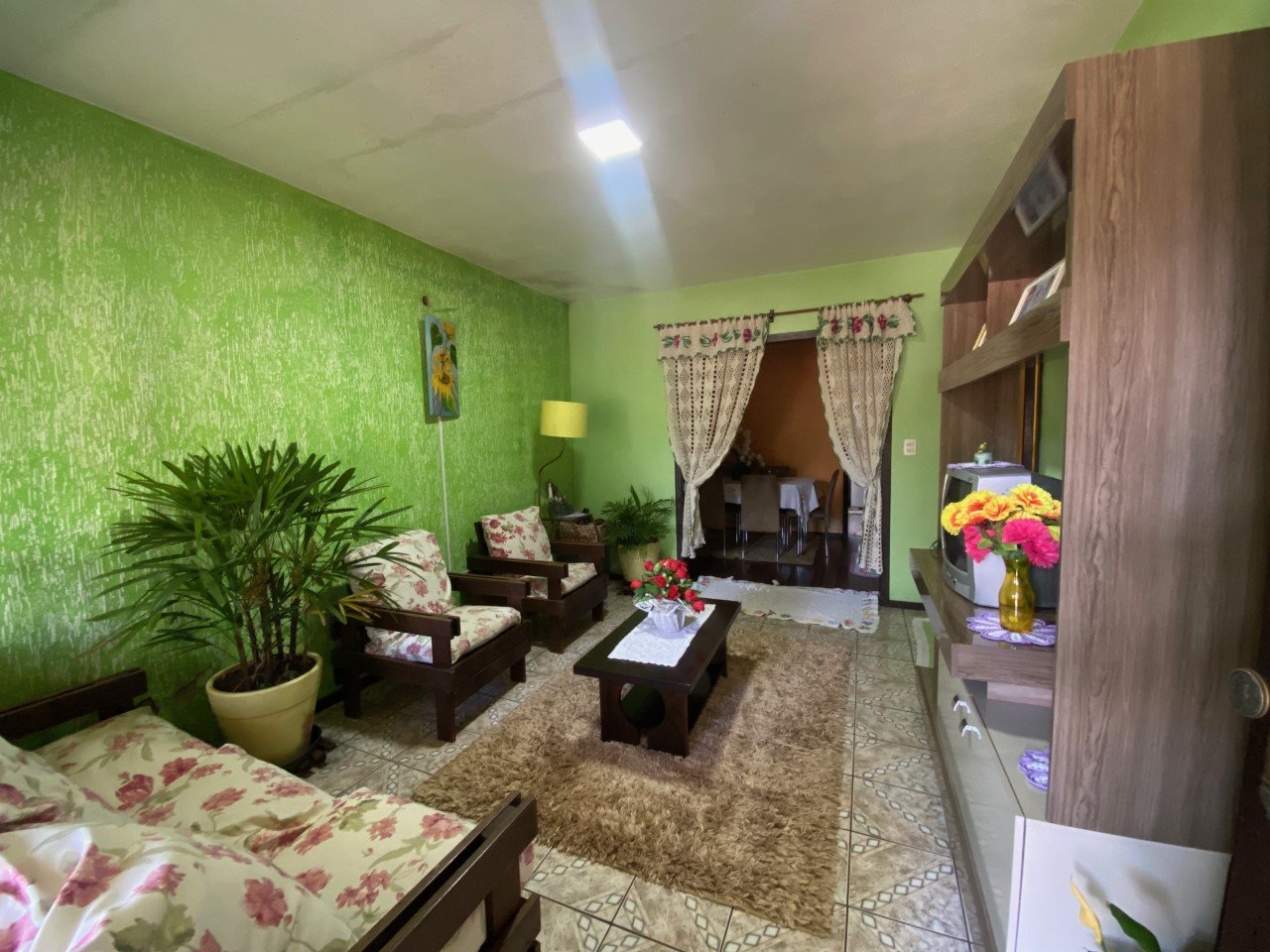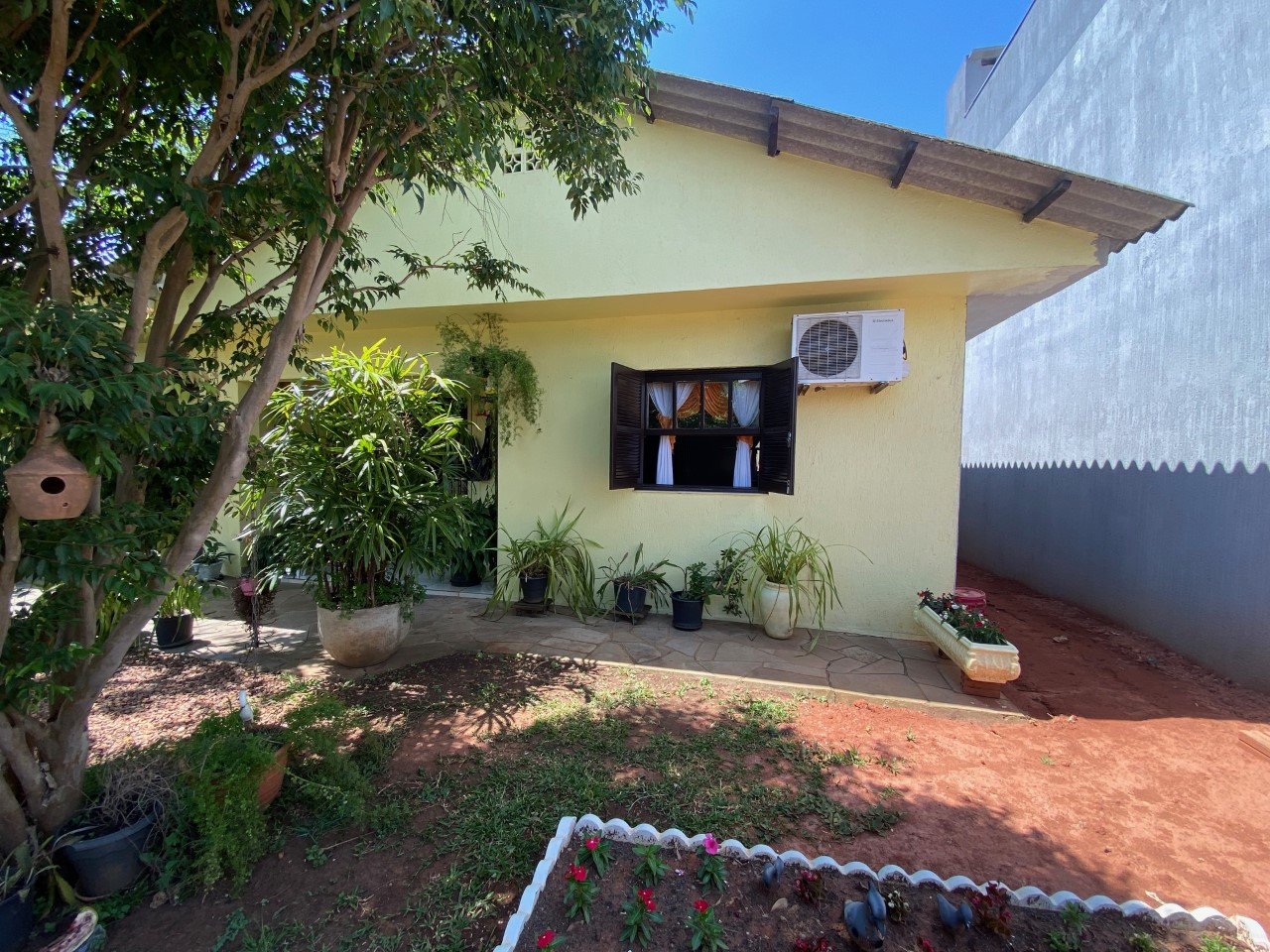 Bela residência em alvenaria, plana com 406 m² de terreno e 208,06 m² de área construída, composta por três dormitórios, cozinha, sala de estar e jantar, três banheiros.